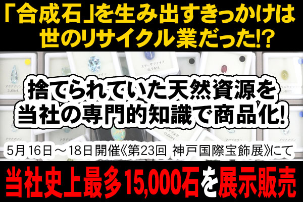 今回の神戸国際宝飾展では、過去の国際宝飾展(東京・神戸)で販売してきた数を上回る当社史上最多の天然色石ルース15,000石を展示販売します。色石ルースを取り扱っている出展社は約20社ありますが、何の宝石かわかるように、全て鑑別して販売している出展社は、リ・ジュエリー部門では当社のみとなります。(※当社の過去出展調べ)