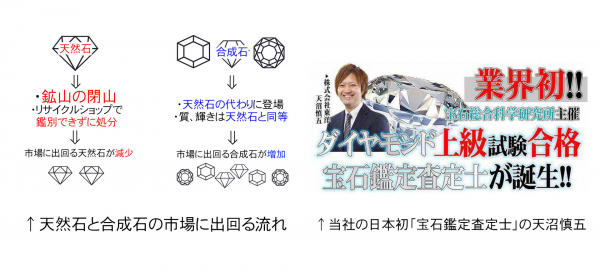 日本では、「合成ダイヤモンド」が今、注目を浴びています。合成石が市場に出回る背景には、天然石が採掘される鉱山の閉山により新しい天然石が採掘されないことや、リサイクルショップがジュエリーを買い取り、買い取ったジュエリーの地金を溶かして再利用されますが、残った宝石は処分されてしまうため、市場に出回る天然石が減少しています。(下記左図参)