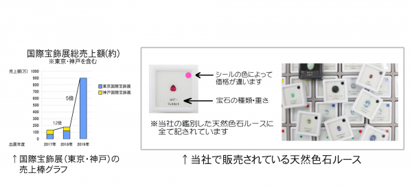 全国各地へ出向き、リサイクルショップで処分された天然石を仕入れ、1つ1つ誰にでも何の宝石かわるように鑑別をして、2017年の国際宝飾展(東京・神戸)に初出展しました。年々売上を伸ばし、5回の展示会だけで、累計約1,300万円分(約6,500石)の天然色石ルースを販売しました。(下記棒グラフ参照)