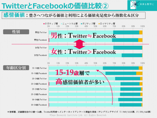 すなわち、男性はTwitterよりもFacebook、女性はFacebookよりもTwitterでの感情価値が高い傾向にあり、Twitterは女性的、Facebookは男性的なSNSなのかもしれないということです。また参考までに、(こちらはある意味想定通りですが)15-19歳層の若いユーザーの方が高い傾向もみられました。