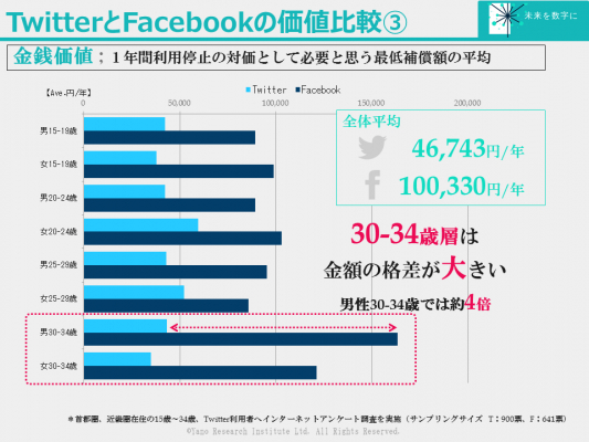 また、これを性別×年齢区分別によって見てる、30-34歳層は他の年齢層よりもTwitterとFacebookの金銭価値の差が大きくなっています。特に男性の差は大きく、大よそ4倍程度の開きがみられました。