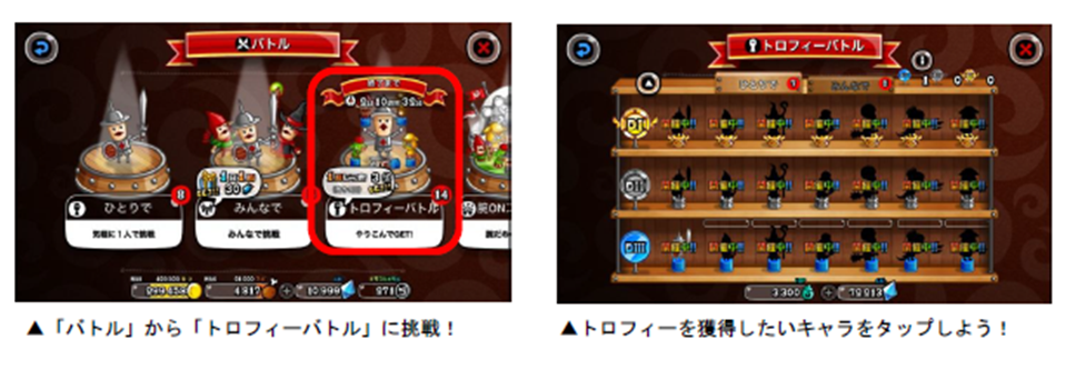 各キャラのトロフィーは、「トロP」を一定数貯めると獲得することができます。トロPは「キャラのLvが20以上」「うまP200以上」など、各キャラによって異なる条件を満たした状態でバトルを行なうと獲得できます。また、バトルを開始すると「ボーナスバトル」が発生することがあり、バトルの勝敗に関係なく、獲得トロPが2・3・5・10倍のうちいずれかの倍率で増加します。ボーナスバトルが発生したら、勝利してトロPの大量獲得を目指しましょう!