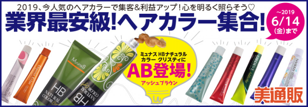 プロ向け美容材料の通信販売サイト「美通販」が、「業界最安級!ヘアカラー集合」キャンペーンを開催します。「2019年の今、人気を集めているヘアカラーで集客・利益アップ!心を明るく照らそう!」と称して、話題の新色・新商品を加えた、今美容業界で人気のヘアカラーを多数ピックアップ。最大51%OFFの業界最安値を目指した低価格設定にてご提供いたします。