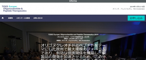 学会:「TIDES Europe: Oligonucleotide and Peptide Therapeutics 2019-オリゴヌクレオチド・ペプチド学会欧州大会 2019年」