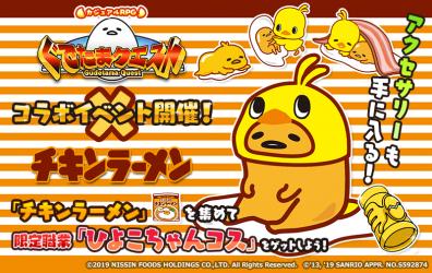 株式会社グッドラックスリー(本社:福岡県福岡市、代表取締役社長:井上和久、以下「グッドラックスリー」)とギャザリングホールディングス株式会社(本社:東京都千代田区、代表取締役CEO 戸田和宏、以下「ギャザリング」)は、株式会社サンリオ(本社:東京都品川区、以下「サンリオ」)よりライセンス許諾を受け、人気キャラクター「ぐでたま」が登場するゲームアプリ『ぐでたまクエスト』(以下、本作)において、2019年5月23日(木)より期間限定で日清食品株式会社「チキンラーメン」とのコラボイベントを開催したことをお知らせいたします。