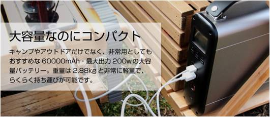 キャンプやアウトドアだけでなく、非常用としてもおすすめな60000mAh・最大出力200Wの大容量バッテリー。
