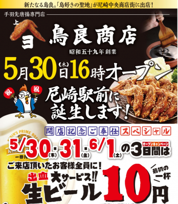 SFPホールディングス株式会社(本社:東京都世田谷区玉川二丁目21番1号 二子玉川ライズ・オフィス10 階 代表取締役社長 佐藤誠)が展開する「鳥良商店」は、2019年5月30日(木)16時に阪神尼崎駅に「鳥良商 店 尼崎中央商店街店」をオープンいたします。オープンを記念して、5月30日、31日、6月1日の3日間は、ご 来店いただいたお客様全員に、生ビール最初の一杯を10円でご提供させていただきます。