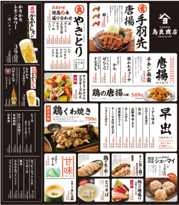創業者の試行錯誤によって生まれた門外不出の秘伝のタレを使った「手羽先唐揚」(1人前 5本 税抜480円)。その味は他店では味わえない鳥良の命と言っても過言ではありません。 鶏の手羽先を、独自にブレンドしたスパイスと、こだわりのタレを用いて、伝統と匠の技 によって揚げられた手羽先唐揚。1984年の創業当時から頑なに守り続けてきたこの味が絶 大なる人気を誇り、鳥良商店の看板メニューとなっています。