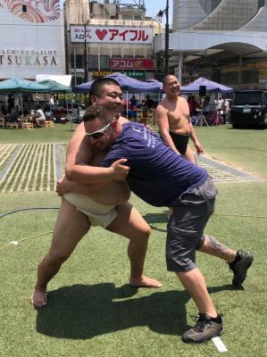 イベントには猛暑に関わらず外国人観光客を含め50名以上の方が参加。人工芝の上に作られた土俵の中で、元プロ力士や相撲芸人のレクチャーを受けて初めての相撲体験を楽しんでいました。