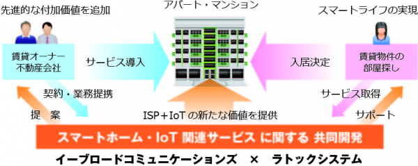 賃貸集合住宅へ全戸一括型ISP事業を展開するイーブロードコミュニケーションズ株式会社(本社:大阪市、代表取締役CEO:佐々木健二 以下イーブロードコミュニケーションズ)と、IoT関連デバイス及びシステムの開発・製造を行うラトックシステム株式会社(本社:大阪市、代表取締役:岡村周善 以下ラトックシステム)は、光インターネット/Wi-Fiを活用したIoT分野において共同で新規事業および新サービス開発・提供を目的とした業務提携契約を締結したことをお知らせいたします。