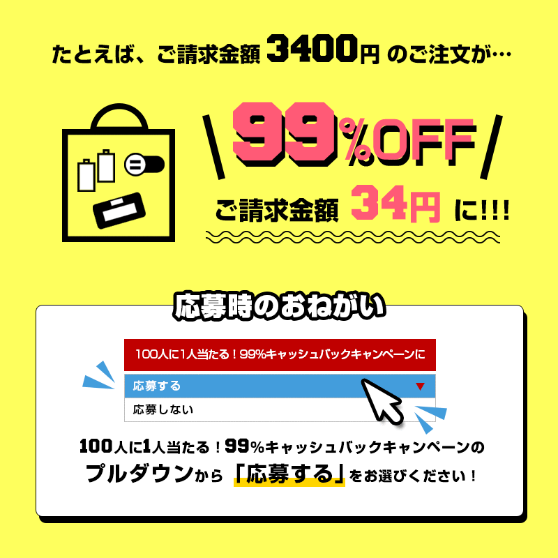 対象店舗でご購入いただいたお客様の中から抽選で100人に1人、ご請求額を99%OFFいたします。