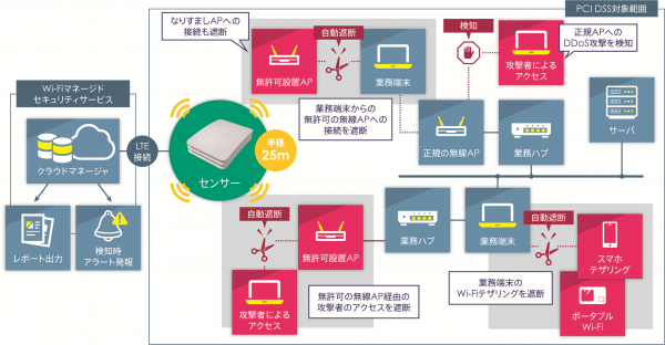 Wi-Fiネットワークを24時間365日常時監視し、無許可の無線アクセスポイントからの通信を即時に遮断できるサービスです。また、監視データを取得することで、PCI DSS準拠のためのレポートを自動で出力することができます。監視センサーを3つ導入することにより、無許可の無線アクセスポイントの場所を特定することも可能です。