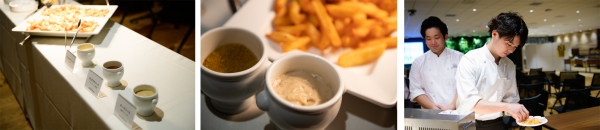 フードを担当したのは、調理研究科の学生5人。元祖フライドポテトと言われている“ベルギー・フリッツ”に合うオリジナルソースを6種類制作し、それぞれの特長を出席者に説明しながら提供しました。