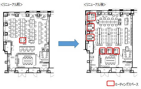 社員からの意見を社長に直接提案できる「ダイレクトアピール制度」をきっかけに、1月31日に自社オフィスをリニューアル。目的は、社内コミュニケーションが取りやすいレイアウトにすること。当社が掲げるWEO(働く環境の最適化)の実現、そして在席率が低い営業部門、施工監理部門でフリーアドレスを適用したグループフリーアドレスの導入など事業で培ったノウハウを詰め込んだオフィスになりました。リニューアル前は、各部署が縦一列に並んだ状態で部署間のコミュニケーションが取りにくい状態でしたが、リニューアル後はデザイン部の配列を横に変えたことにより、各部署からデザイン担当者へのアクセスがとりやすくなりました。また、以前は1カ所しかなかったミーティングスペースを、リニューアル後は窓際の柱をうまく活用してエリア区分し、6カ所確保。オフィスの入り口近くにファミレスブースを設けることで、社員同士が集まる場所が増えました。リニューアル後の社内アンケートでは、約97%の社員が「自分から話しかけたり、他の人から話しかけられたりする機会が増えた」「その日座ったデスクで、近くの人たちと話す機会が増えた」「個人用ロッカー周りでの会話が増えた」など、社内コミュニケーションが円滑になったと答えています。