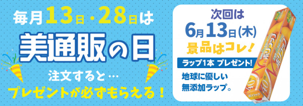 次回の「美通販の日」は、6月13日(木)に開催。今回のプレゼントアイテムは、地球に優しい「無添加ラップ」をご用意しました。安心・安全の添加物ゼロで使いやすい人気のポリラップを、注文された方にもれなく1本プレゼントいたします。サイズも30cm幅×40m巻ですので、たっぷりお使いいただけます。