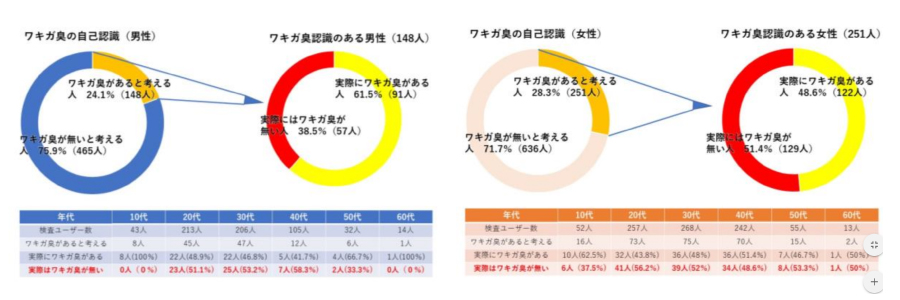 個人の体臭を検査し、体臭改善のサポートを行う「体臭クリーニング(株式会社ベネフィット-イオン)」では、保有する体臭検査ユーザー1500人分のデータを保有するデータを分析し、実際にワキガ臭(微弱なものも含む)のあるユーザーのうち、48.3%(男性58.1%、女性41.3%)の人が自分自身のワキガ臭を認識していないという事実を明らかにしました。