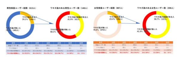 個人の体臭を検査し、体臭改善のサポートを行う「体臭クリーニング(株式会社ベネフィット-イオン)」では、保有する体臭検査ユーザー1500人分のデータを保有するデータを分析し、実際にワキガ臭(微弱なものも含む)のあるユーザーのうち、48.3%(男性58.1%、女性41.3%)の人が自分自身のワキガ臭を認識していないという事実を明らかにしました。