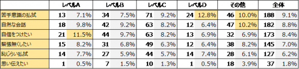 次に、「自信をつけたい」「苦手意識払拭」「自然な会話をしたい」「緊張をなくしたい」「恥じらいを払拭したい」「思いを伝えたい」など受講のモチベーションを選択してもらいました。TOEICでハイスコアを取得している レベルAでは「自信をつけたい(11.5%)」、レベルDでは「苦手意識の払拭(12.8%)」の回答率が最も高い結果となりました。これにより、ハイスコアを取得していても、英会話に自信を持てない人がいることが分かります。こうした“心の障壁”により、英語を話すことを邪魔している状態なのです。