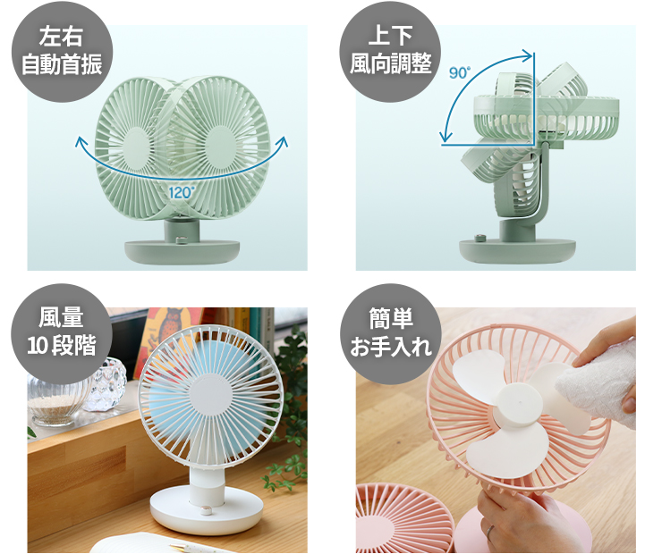 また、本製品はUSB充電式のため電池いらずで、一度充電すればコードレスで最長約11時間の連続使用が可能(風量:弱の場合)です。