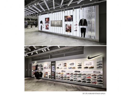 ブランドのフォーカスアイテムやブランドMIXのスタイル提案などマルチなPOP UPスペースとしても活用できる“CENTER STAGE”や、ブランドやシューズのイメージを打ち出しながらシューズを陳列できるウォールが設置され、商品イメージ・ブランドイメージをクリアにそしてダイレクトに伝えることに比重を置いたストアデザインがされています。