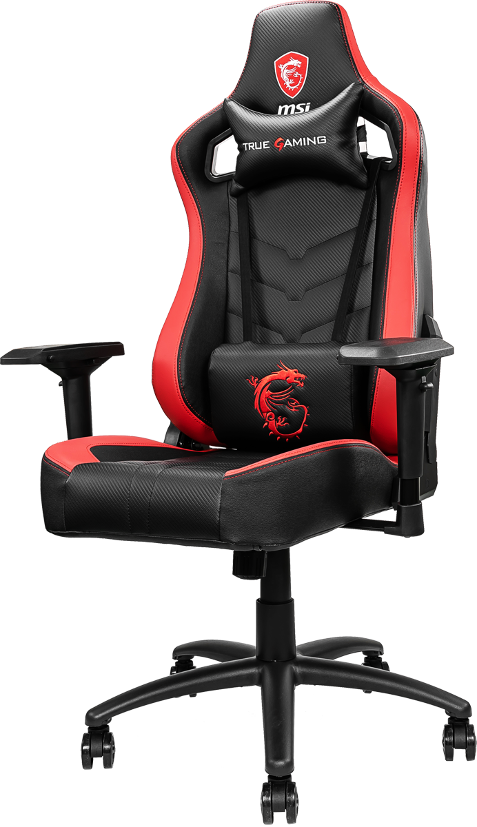 ヘッドレストとクッションにはMSIドラゴンロゴをあしらうとともに、ブラック&レッドのツートンカラーでゲーミングシステムとの相性も抜群。5輪ツインホールキャスターは、床を傷つけにくく移動も容易で、ガスシリンダー方式の高さ調整によって、座面高さを46~54cmのレンジで調整することができ、あらゆるデスクに対応できます。