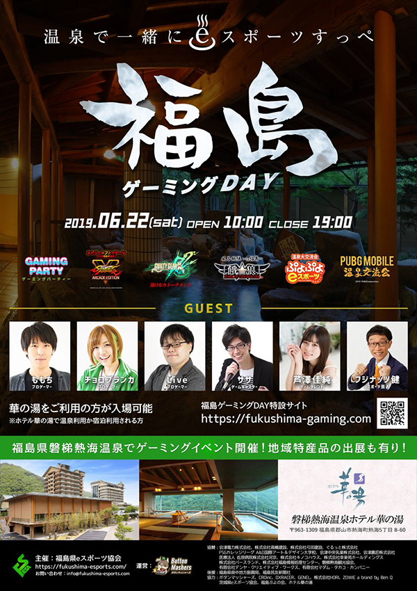 『福島ゲーミングDAY』は、eスポーツやゲームの大会・パーティーを福島の観光名所で行う本格ゲーミングイベントです。 第一回となる今回は東北屈指の温泉宿「磐梯熱海のホテル華の湯」のコンベンションホールで開催されます。 ゲームはもちろん、福島県の特産品が楽し」めて、温泉が楽しめる日本初のリゾート型ゲーミングイベントとなっております。 復興に向かう「ふくしまの今」と復興の先の「新しいコンテンツ」が同時に体験できます。