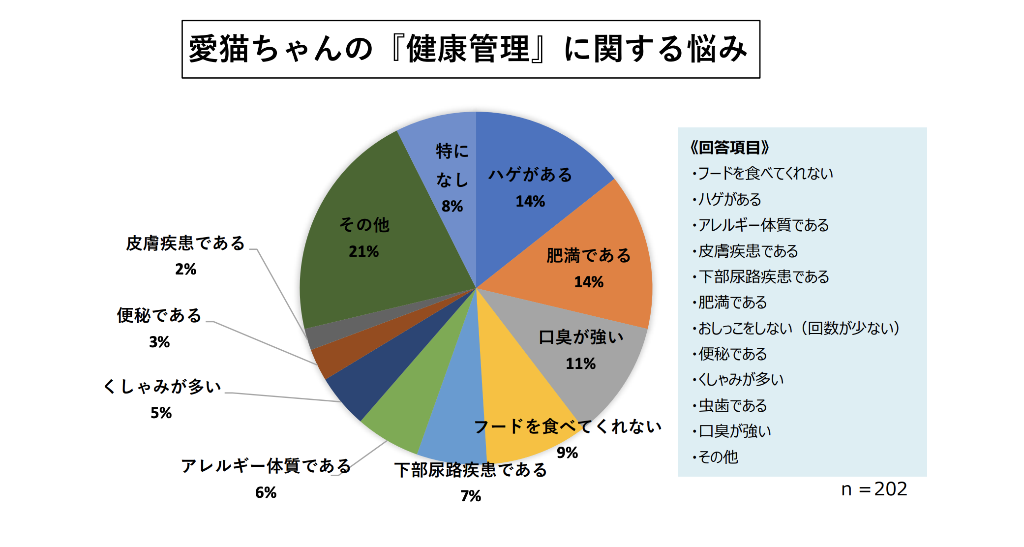 さらに、122 人の回答者がそれぞれ2つ以上の回答をしていることからも、愛猫ちゃんに対する健康上の悩みは尽きないと感じています。