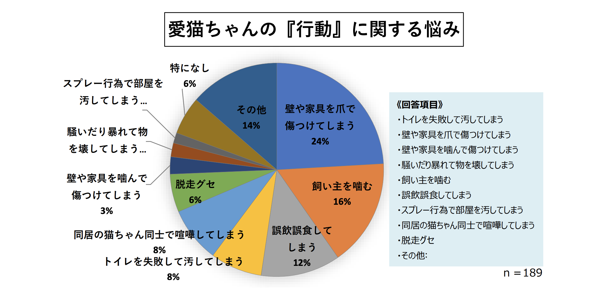 愛猫ちゃんの『行動』に関するお悩みの中で最も多かったのが、「壁や家具を爪で傷つけてしまう」(24%)で、続いて「飼い主を噛む」(16%)「誤飲誤食をしてしまう」(12%)でした。つまり、いただいた189 の回答のうち、4 割近くがお部屋内の汚れや破損についてだったことがわかります。