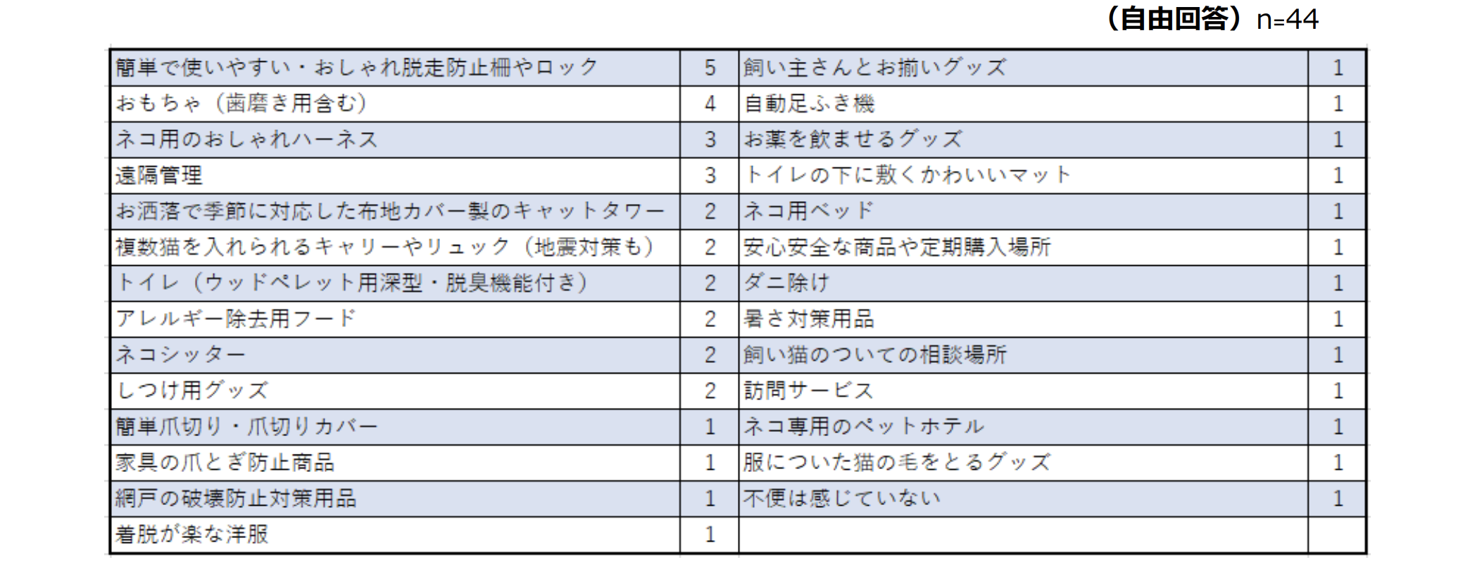 猫ちゃんとの快適な暮らしのために、欲しい商品としておしゃれな「ハーネス」「キャットタワー」や「おもちゃ」などのグッズから「脱走防止柵」や「網戸の破壊防止策」の用品など多岐にわたり、猫ちゃんグッズがいまだ充実していないことを改めて認識する結果となりました。また、飼い主さんの留守を守る「遠隔管理」や「ねこ専用のペットホテル」や「シッターさん訪問サービス」、さらには飼い主さんにとっての「猫ちゃん相談場所」を書かれている方もいました。