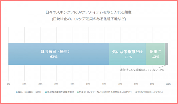 まず、敏感肌の人たちが日々のスキンケアにUVケアアイテム(日焼け止め、UVケア効果のある化粧下地などを含む)を使う頻度をたずねたところ、半数以上の人がほぼ毎日、年間を通して何かしらのUVケアアイテムを取り入れていることが分かりました。