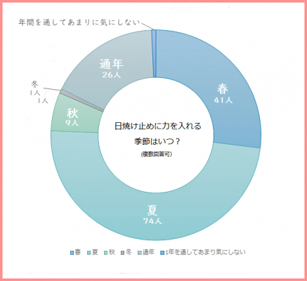 日焼け止め・UVケアに力を入れる季節はいつ?という質問では、圧倒的に夏は注力する!という回答が多くなりました。