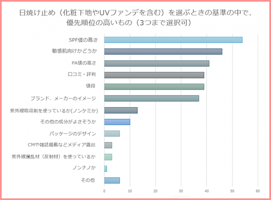 SPF値、PA値の高さという機能的な面が上位になったのとともに、敏感肌向けかどうかを意識している人が多いことが分かります。