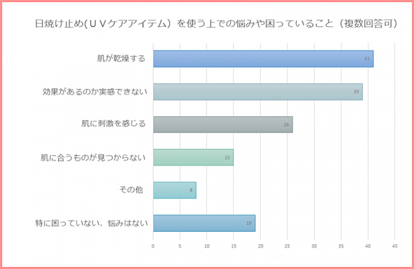 日焼け止めアイテムを使う上での悩みや困っていることのトップになったのは、「肌が乾燥する」ことでした。