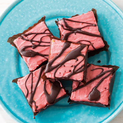 チョコレート生地にラズベリーの果実を練りこんで焼き上げたブラウニーに、クリームチーズとラズベリージャムを合わせたアイシングをトッピング。仕上げにチョコレートで模様を書いた濃厚な甘さのブラウニーです。