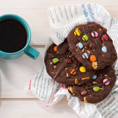 チャンク状のチョコレートが入ったソフトクッキー生地に、色とりどりのマーブルチョコレートをのせて焼き上げました。仕上げにライン上にチョコレートを絞ったトッピングをほどこした、コーヒーと好相性の甘いクッキーです