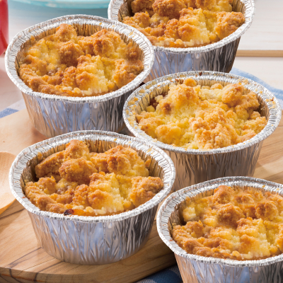 賽の目にカットしたマフィンの上に自家製黄桃フィリングを流しいれ、クランブルをのせて焼き上げました。シナモンをきかせた黄桃フィリングが特徴のカップ入りスイーツです。