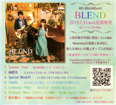 Office La Mer(以下、オフィス ラメール)は、進化系90年代テイスト・ポップスバンド「Neontetra(ネオンテトラ)」の4作目となる最新ミニアルバム『BLEND(ブレンド)』を、音楽レーベル「La Mer(ラメール)」より、2019年7月31日(水)に全国リリースいたします。発売にともない、7月29日(土)の発売記念ライブを皮切りに、全国6都市をまわる「Neontetra『BLEND』全国ツアー2019」を開催いたします。