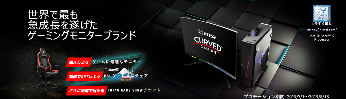 2019年7月4日 - Micro-Star International Co., Ltd. 台湾・新北市 - GAMINGハードウェアの設計で世界をリードするMicro-Star International(MSI)は、世界的に有名な調査会社であるWitsVieにより、湾曲型GAMINGモニター市場において「世界で最も急成長を遂げたブランド」と評価されたことを記念して、2019年7月1日~8月18日の期間に指定のGAMINGモニター製品をご購入の方に抽選でMSI製GAMINGチェアを、また指定製品をご購入の方全員にMSIオリジナルスピーカーをプレゼントする「世界で最も急成長を遂げたゲーミングモニターブランドキャンペーン」を実施いたします(期間中でも在庫がなくなり次第終了)。