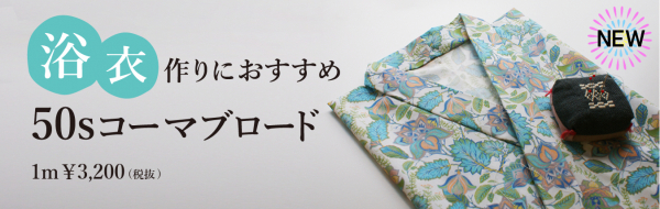 「50sコーマブロード」は綿100%、平織の滑らかで心地よい肌触りで、オリジナルの浴衣作りにおすすめの生地です。シャツ作りの定番商品「40sブロード」とよく似ていますが、「50sコーマブロード」の方が糸が細く、若干薄手でしなやかです。価格は1m3,200円(税抜)です。