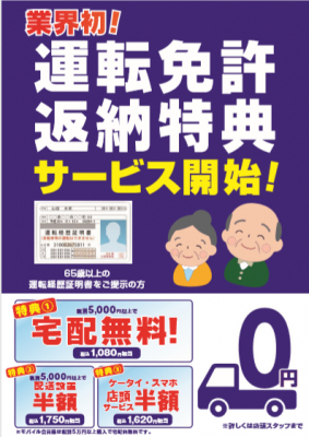 株式会社ノジマ(神奈川県横浜市、代表執行役社長 野島廣司)は、2019年7月6日(土)より家電業界では初の、運転免許証を返納された65歳以上の方を対象とした家電配送及び店頭サービスを全店舗で開始いたします。