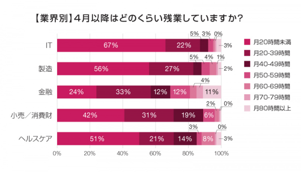 この結果を回答者が従事する業界別に見ると、IT、製造、ヘルスケアの業界では過半数が20時間未満である一方で、金融業界では43%が月40時間以上残業しているなど時間外労働の多さが目立ちます。