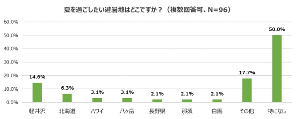 さらに、「夏を過ごしたい避暑地はどこか?」聞きました。『特になし』が半数を占めるなか、様々な回答があがり、1位は『軽井沢』(14.6%)、2位は『北海道』(6.3%)となりました。また、長野県は、「軽井沢」をはじめ、「八ヶ岳」「長野県」「白馬」「上高地」と県内の地名が多くあがり、回答地名の48.0%を占めていることもわかりました。