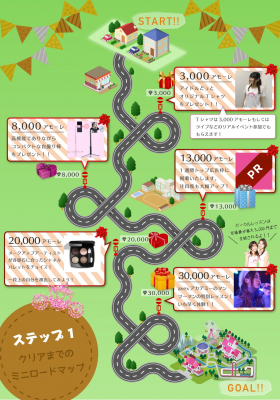 アイドル発掘応援サービス「アイドルどっと」では、プロデューサー(ユーザー)の応援によって一般のアイドルになりたい原石をアイドルへと成長させることができます。プロデューサーの応援により得られる特典をさらに増やし、アイドルに近づく為のアイテム等がもらえるミニステップを複数設置しました。