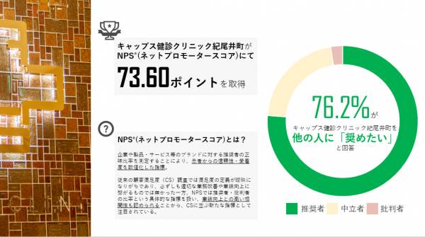 キャップス健診クリニック紀尾井町では、医療・接遇のクオリティアップを図るため、2019年6月より、NPSを重要指標のひとつとして導入いたしました。導入初月となる2019年6月度のNPSは73.6ptの高スコアとなり、現状において一定の評価を得られていることが確認できました。今後もNPSを継続的にモニタリングし、具体的なアプションプランを通じて推奨者に評価されている要因を強化し、批判者が生じた原因を解消していくことで、一層のクオリティアップを図ってまいります。