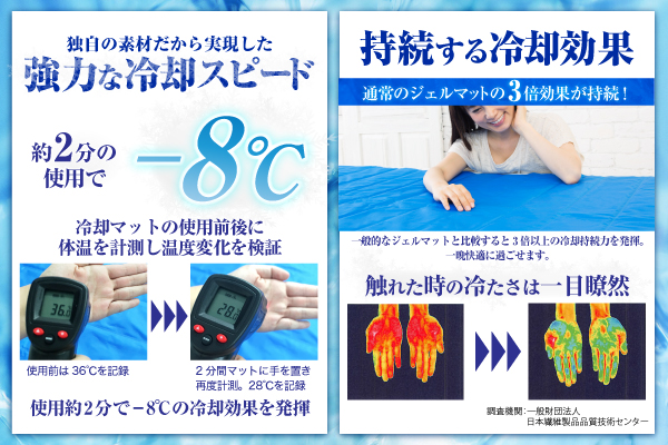 その特徴とは硫酸ナトリウム、セルロース、ホウ砂、グリセリンを独自の比率で配合した素材になります。30前後で水溶化と結晶化を繰返し、人が心地よいと感じる温度を維持します。吸熱・放出を繰り返すため、程よい冷たさが維持し、通常のジェルマットに比べて冷却力も3倍効果が持続します。