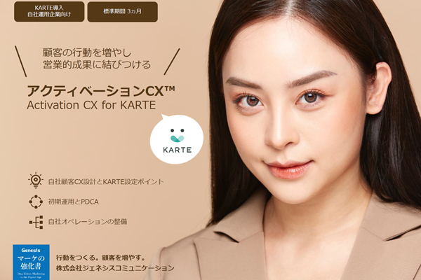 「マーケの強化書」を運営する株式会社ジェネシスコミュニケーション(所在地:東京都千代田区 代表取締役社長:杉田 裕一)は、CX(顧客体験)プラットフォームKARTE(カルテ)のウェブ営業力アップの支援プログラム「アクティベーションCX for KARTE」のサービス提供を2019年7月23日(火)より開始します。