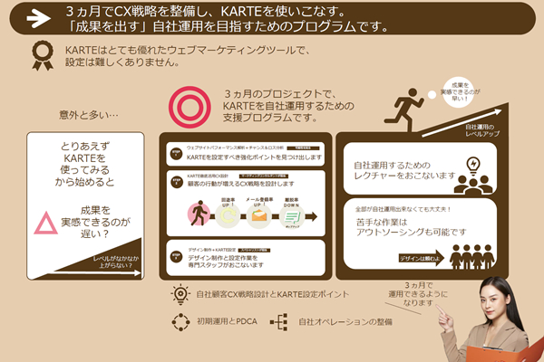 CX(顧客体験)プラットフォームKARTE(カルテ)を使いウェブ営業力アップを支援する「アクティベーションCX for KARTE」。標準期間3ヶ月かけ、自社運用を目指すためのこの支援プログラムには、下記3つのプログラムが含まれます。