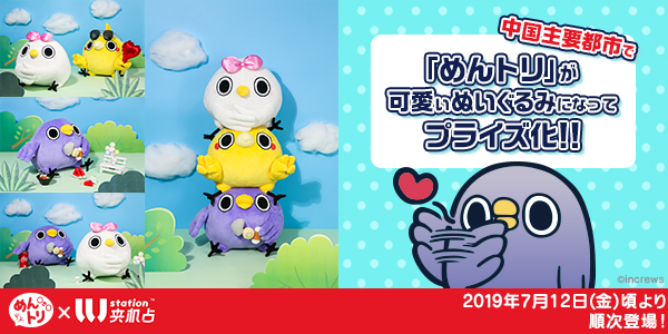全世界のLINE Creators Marketだけで累計270万ダウンロード&送受信数34億回を突破し、日本だけでなく、全世界で大人気LINEスタンプ「面倒だがトリあえず返信」から生まれた株式会社インクルーズのオリジナルIPの「めんトリ」は、700種類を超えるグッズ化、Production I.G制作でのアニメ化、10作品を超えるゲームコラボ、宝島社での書籍化、世界に僅か300種類しか選ばれていないFacebook公式スタンプの採用、台湾での大型展示会の開催、Vtuberデビューに続き、今度は中国本土でプライズとして登場します。