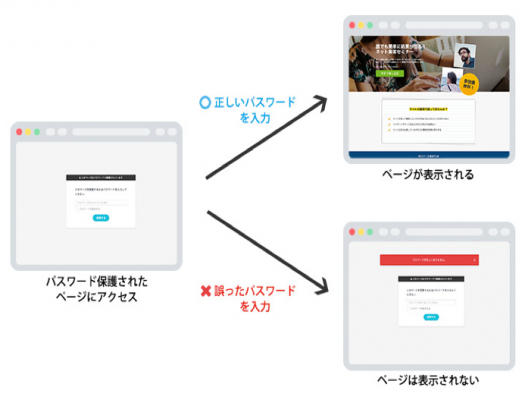「パスワード保護機能」は、『ペライチ』で公開されたページに掲載されたコンテンツをパスワードで保護し、閲覧に制限をかけることができる機能です。会員向け限定コンテンツを配信したい場合や、一般公開前のページを関係者に確認してもらう場合など、ページの掲載内容を限定したい場合にご活用いただくことを想定しております。