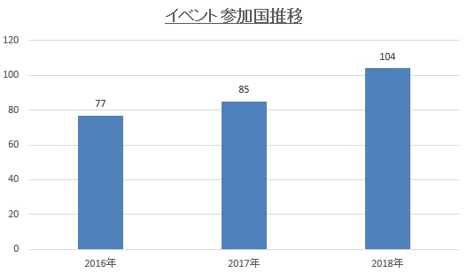 年々イベントの規模は拡大し、2016年には77カ国だった参加国が、昨年は104カ国と、この2年で135%に増加し、今年はさらなる盛り上がりが予想されます。